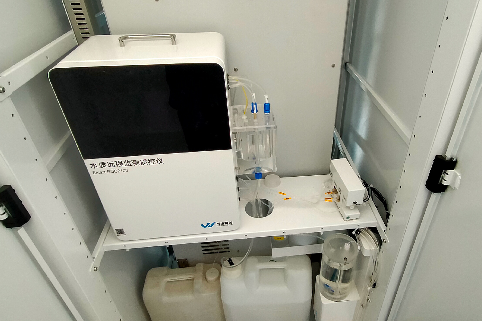 Smart RQC2100型水质远程监测质控仪(加标功能性)与水质分析仪器联用,提供零点、跨度等多种标液以及加标试样,完成水质分析仪器的零点/跨度核查、24小时零点/跨度漂移、多点线性核查、加标回收率测试、集成干预检查、实际水样比对、平行样测试等质控工作,进行测试数据的采集、分析、上传,分析判断水质分析仪器的工作状态,保证测量数据的有效性。